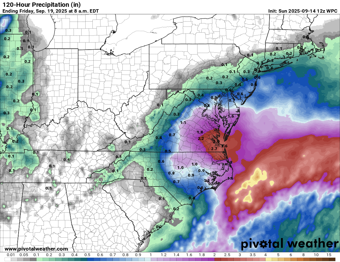 In addition, it is also looking likely now that there will be heavy bands of soaking rain to occur across much of eastern North Carolina, central and eastern Virginia, much of Maryland and much of Delaware. Across these areas, rain totals of 1 to 3 inches can be expected from late Monday until Thursday morning.