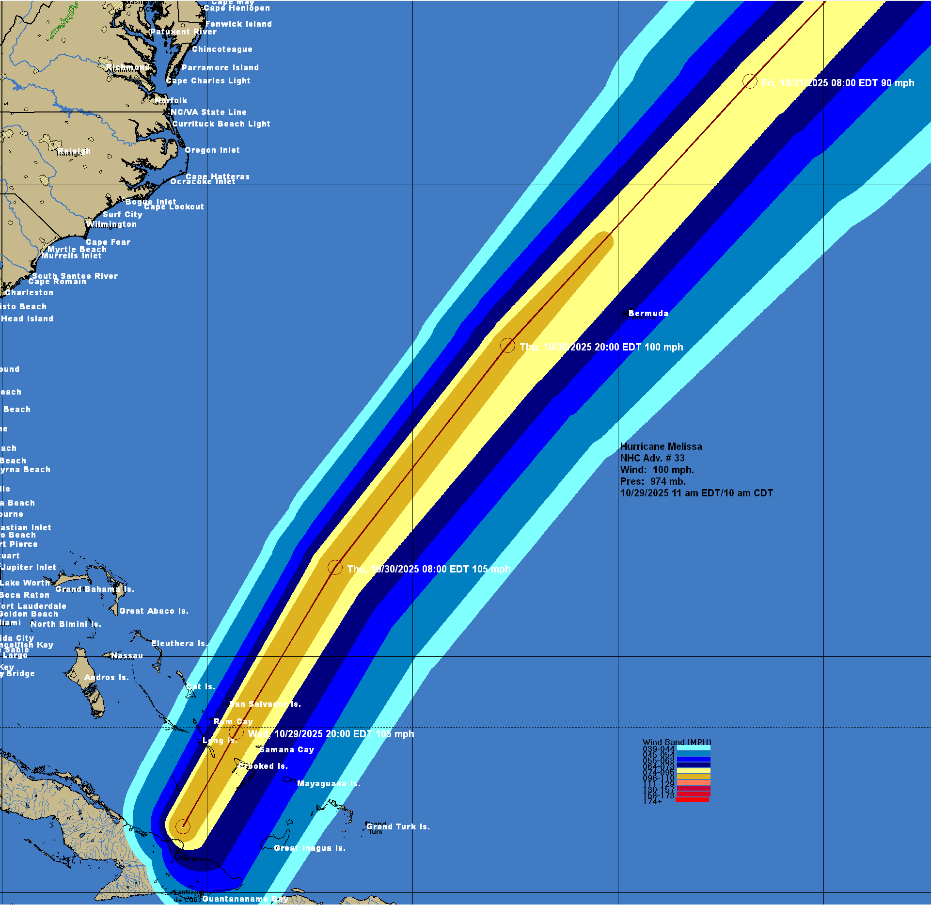 Beyond this, Melissa will speed up in its forward motion & it appears very likely that the hurricane will pass just west of Bermuda on Thursday night as a borderline Category 1-Category 2 hurricane. I do think that the hurricane will pass close enough to Bermuda to bring hurricane conditions to the island throughout Thursday night & all island interests should be ready for this hurricane.