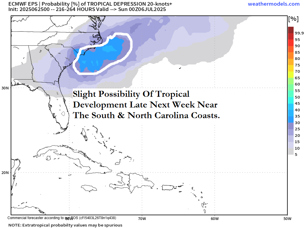 Tropical Development Is A Slight Possibility Near The Southeastern Coast Of The United States Late Next Week: Some of the model guidance (particularly the Canadian model) continues to hint that there will be the development of a low pressure system near the tail end of a frontal boundary near the South and North Carolina coasts around Thursday and Friday of next week. This low pressure system is then forecast by the model guidance to track northeastward passing near or just east of Cape Cod by next weekend. Additionally, the European ensemble model guidance is forecasting around a 30-35 percent chance for tropical development near the South and North Carolina coasts during the late parts of next week.