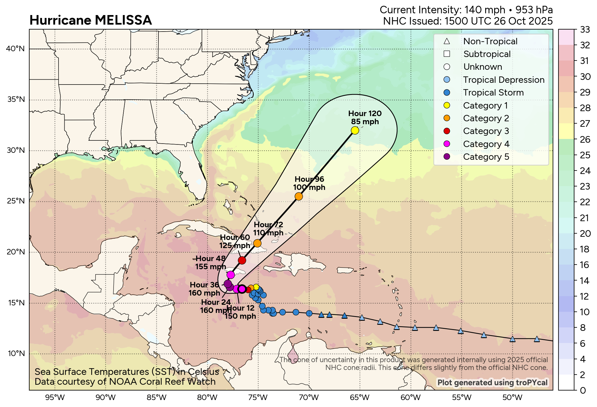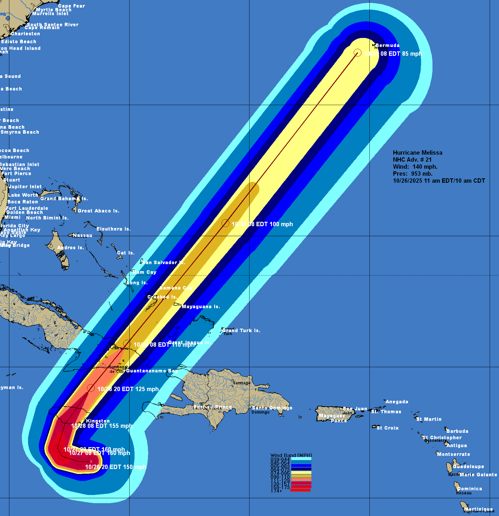 Bermuda: It remains quite possible that Melissa could impact Bermuda as a hurricane on Thursday night. I urge all interests on the island to monitor the progress of Melissa extremely closely.
