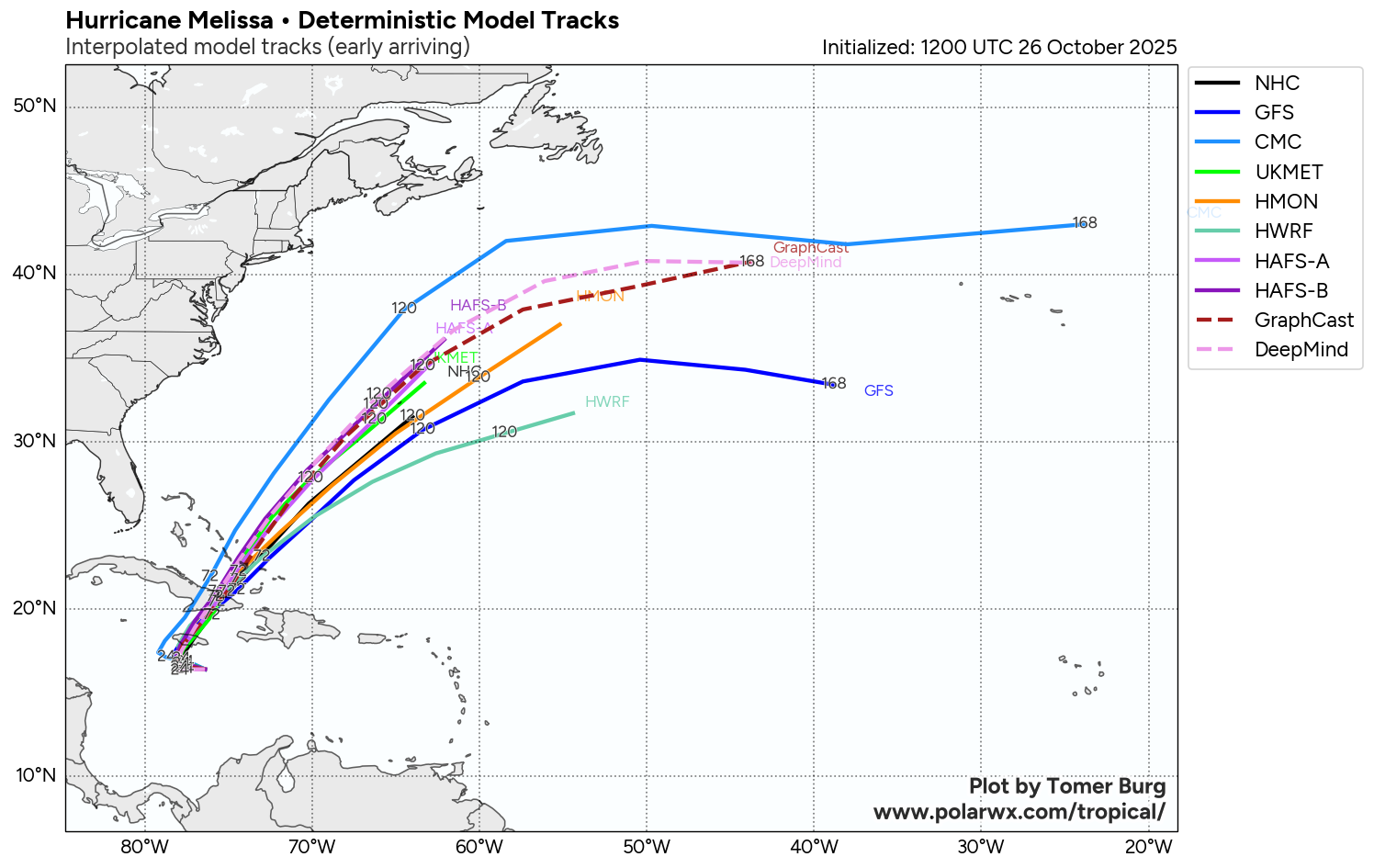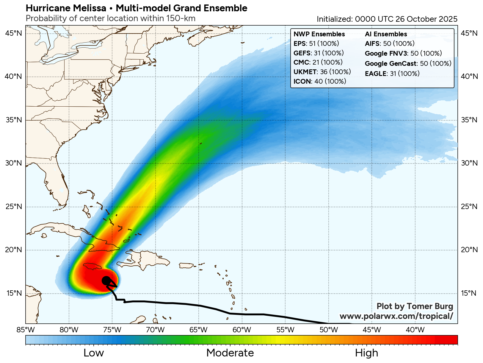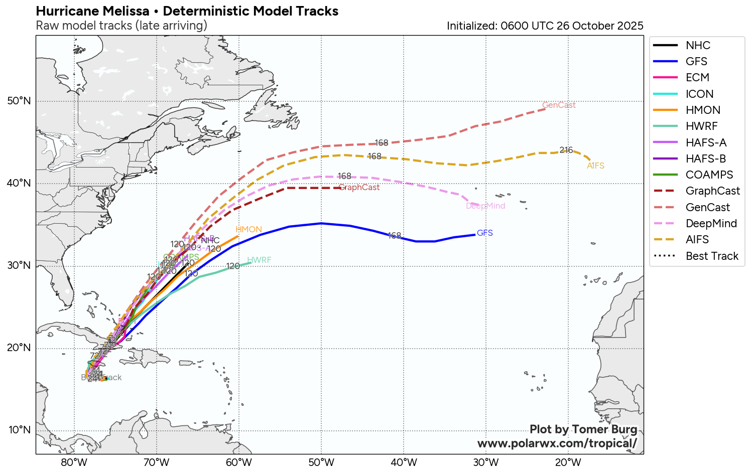 It should be noted that both of the very high resolution HAFS hurricane models are forecasting a peak intensity at landfall with these models forecasting Melissa having maximum winds of 170 to 175 mph. A majority of the Google Deep Mind AI ensemble models forecast a landfall intensity of Category 4 strength, however, a few members forecast Category 5 intensity.