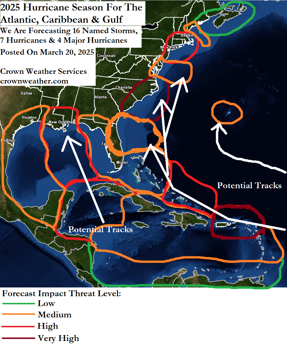 Landfall Threat Forecast: There are no changes at all with my landfall threat forecast. In the map attached to this discussion, I have added my expectations of the most likely potential tracks of tropical systems this season.