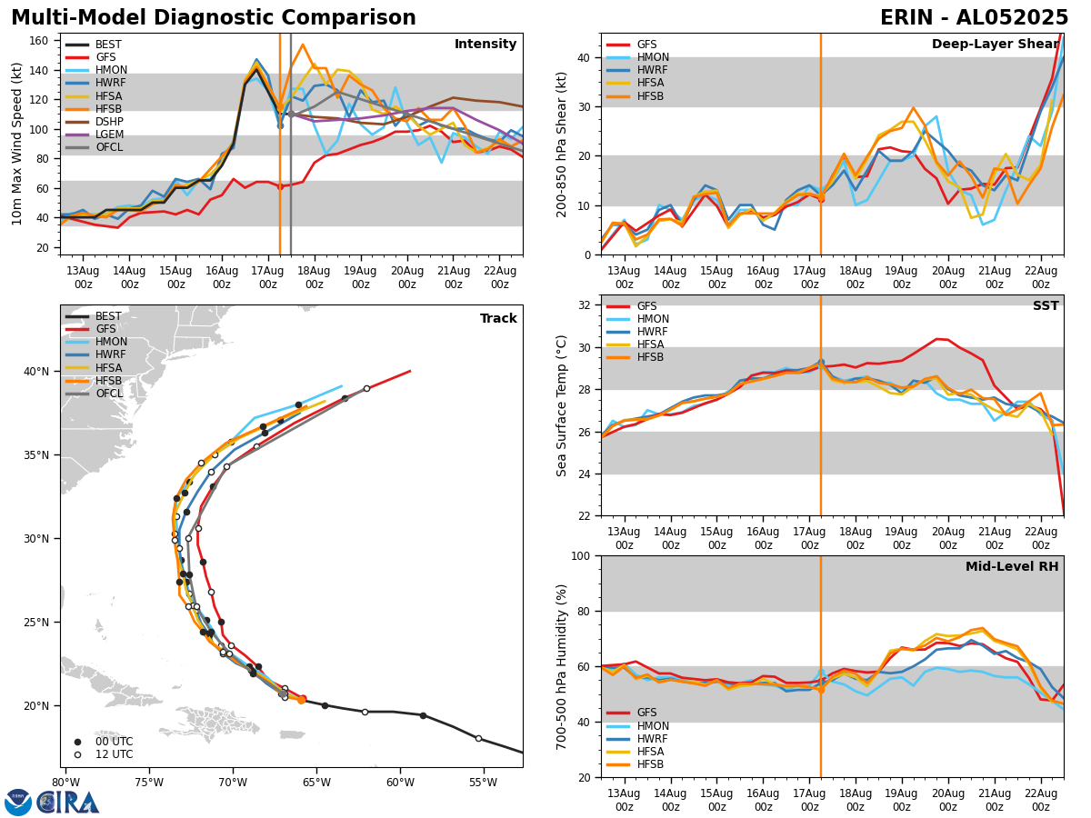 While the track model guidance with Erin are in good agreement in showing the hurricane making that turn to the north, they do still disagree on how quickly this turn will occur & thus how close Erin gets to the Bahamas and the North Carolina Outer Banks. It should be noted that the track guidance has been continually shifting westward in their forecasts of Erin & this has raised my concern slightly for the eastern Bahamas and the North Carolina Outer Banks. I do want to emphasize though that there are no models at all that are forecasting a direct hit on the Bahamas or the East Coast of the United States. Instead, some of the guidance are showing a close brush.