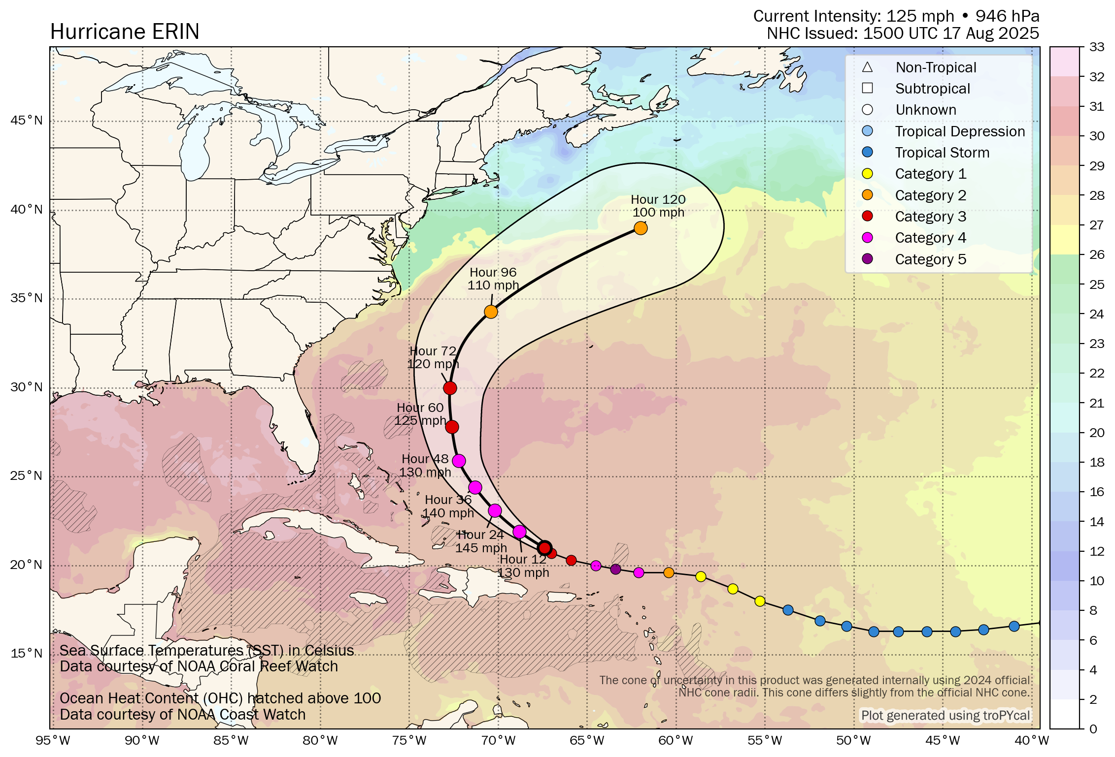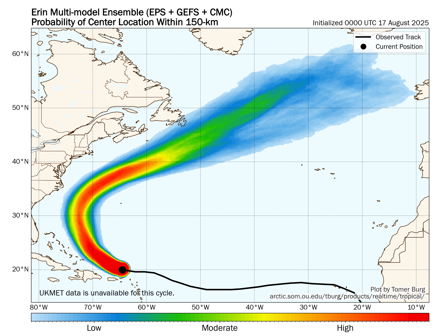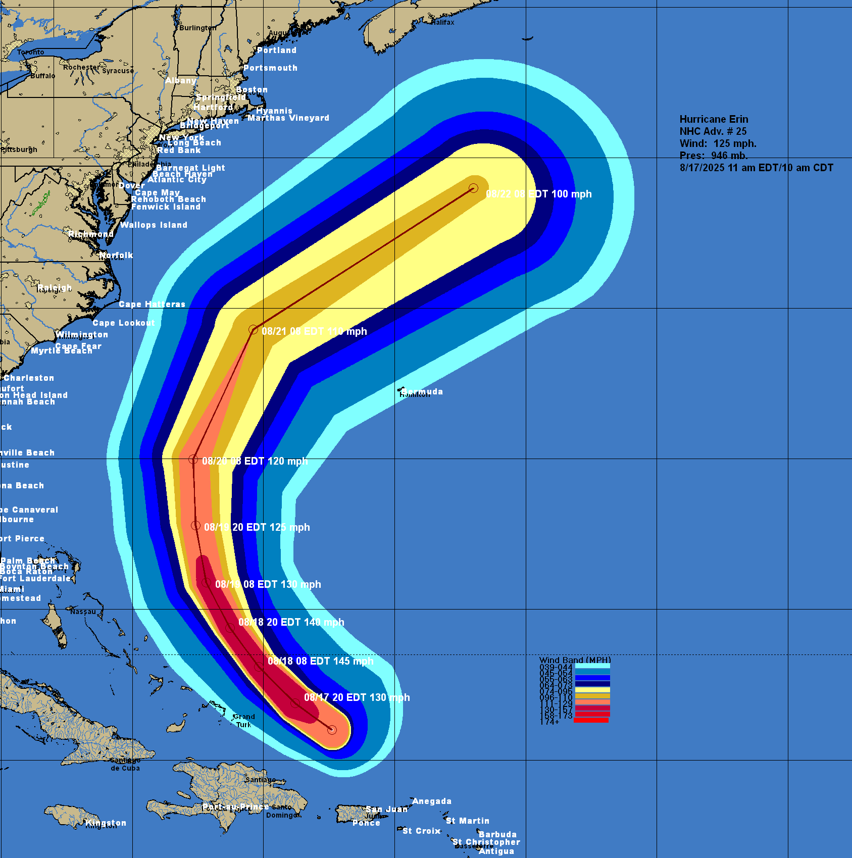 For Bermuda: It continues to look very likely that Erin will pass far enough west of Bermuda to not be a direct impact. The very large size of Erin could lead to some of the outer bands of rain to affect the island on Wednesday and Thursday.