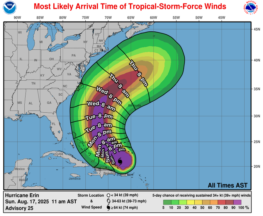 For The East Coast Of The United States & Particularly The North Carolina Outer Banks: First things first, ignore the clickbait on social media, Erin IS NOT going to directly strike the East Coast of the United States. It is, however, expected to pass just offshore of the US East Coast, close enough to the North Carolina Outer Banks to perhaps bring tropical storm conditions there during the day on Thursday.