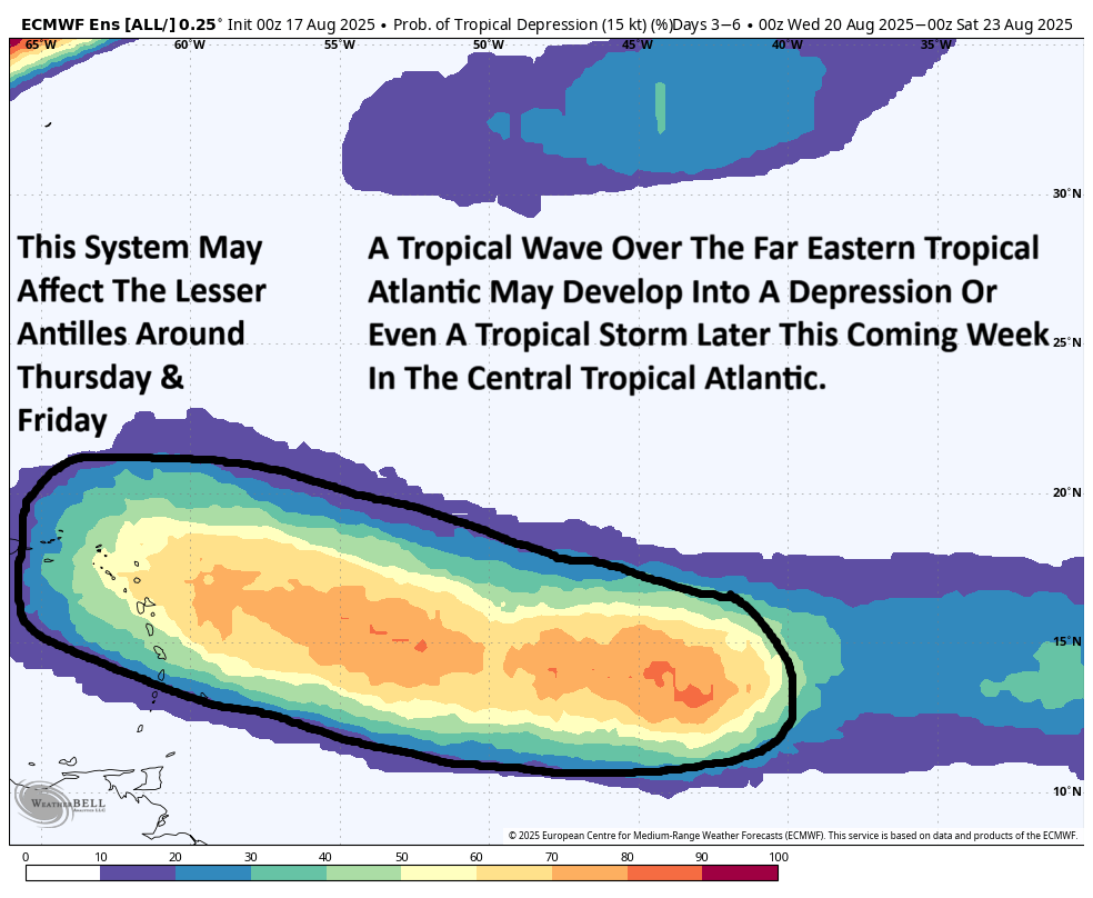 My recommendation for those of you in the Lesser Antilles and the eastern Caribbean is to monitor this wave extremely closely during this upcoming week and be aware that it could be a depression or even a tropical storm by the time it reaches the islands of the eastern Caribbean around Thursday into Friday.