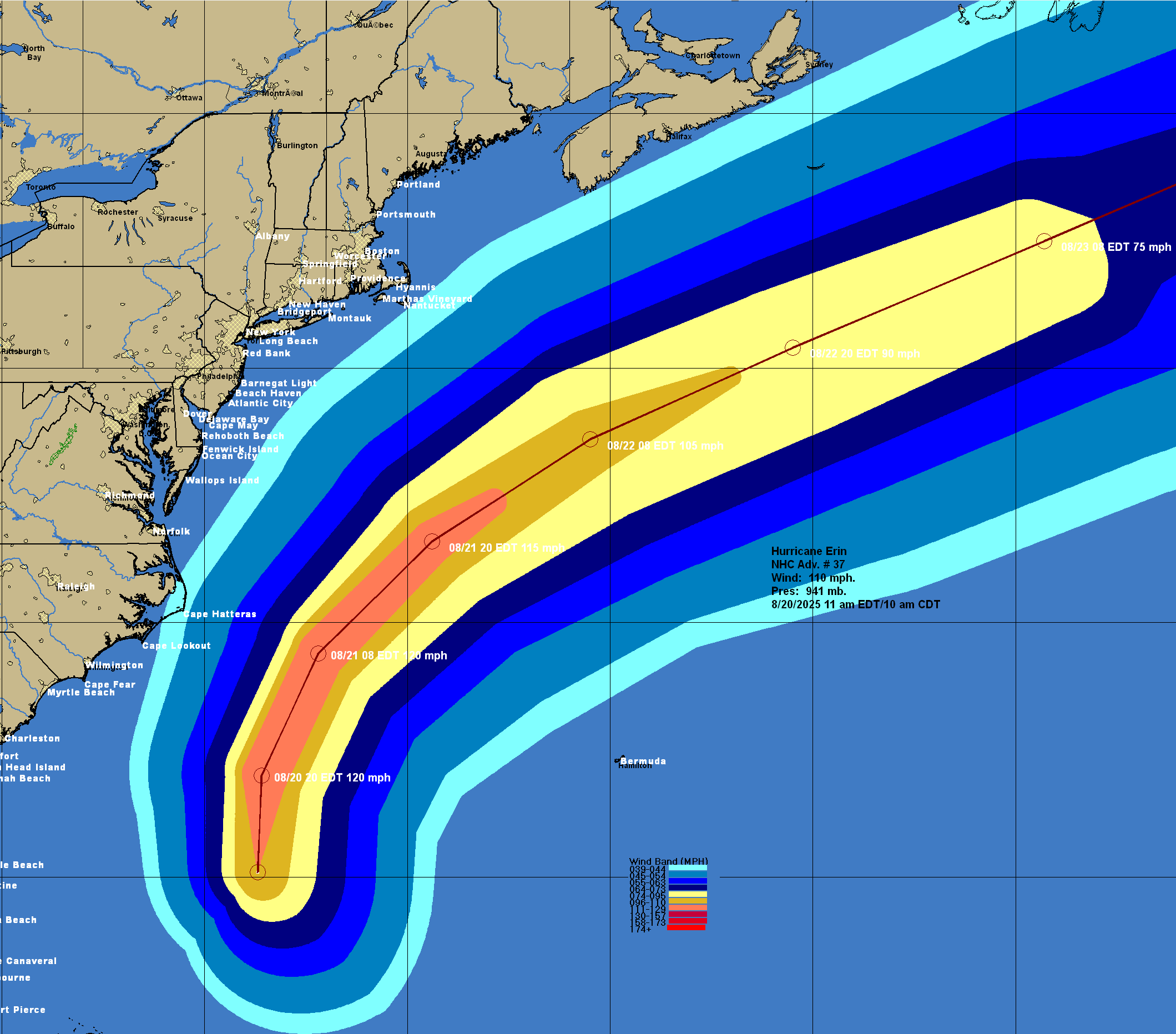 For Bermuda: It continues to look very likely that Erin will pass far enough west of Bermuda to not be a direct impact. The very large size of Erin could lead to some of the outer bands of rain to affect the island through Thursday.
