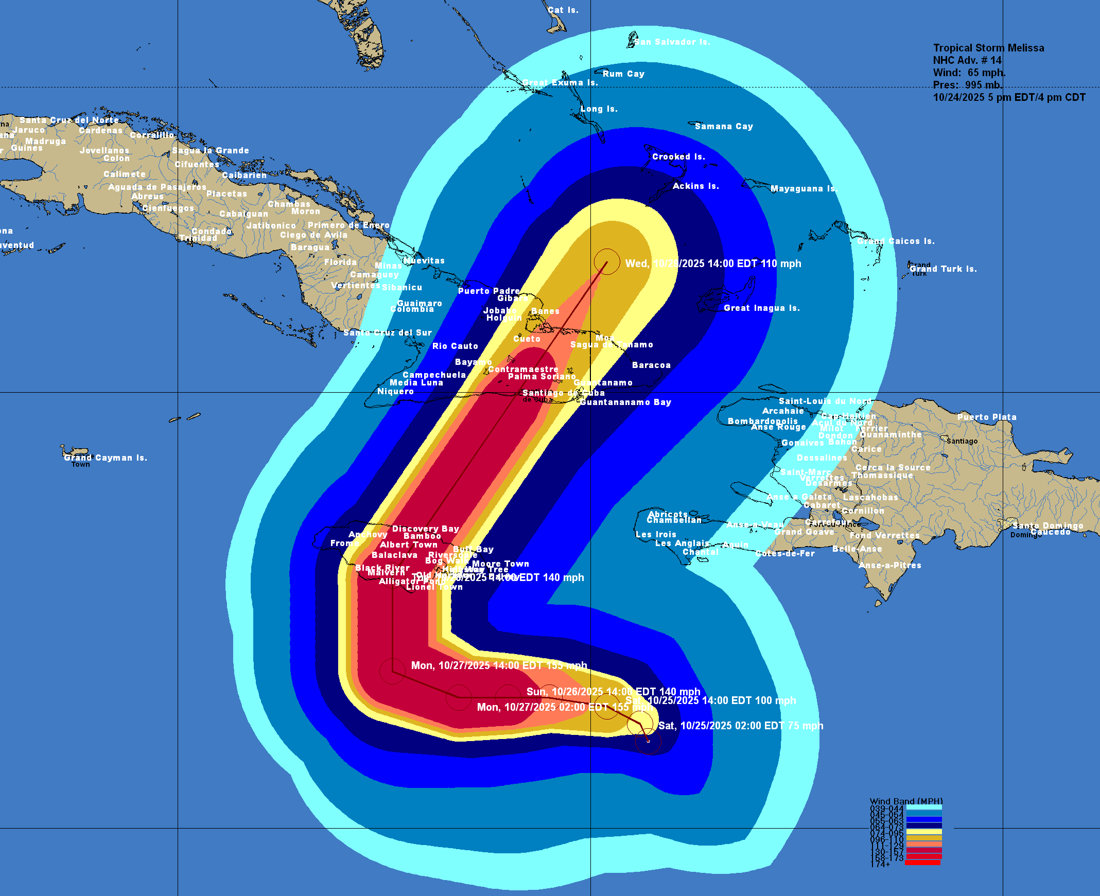 Even more concerning is that there is the potential for the core of the hurricane, which could contain Category 4 to even Category 5 winds to move directly over the island during the day on Tuesday as Melissa is pulled to the northeast & ultimately out of the Caribbean.