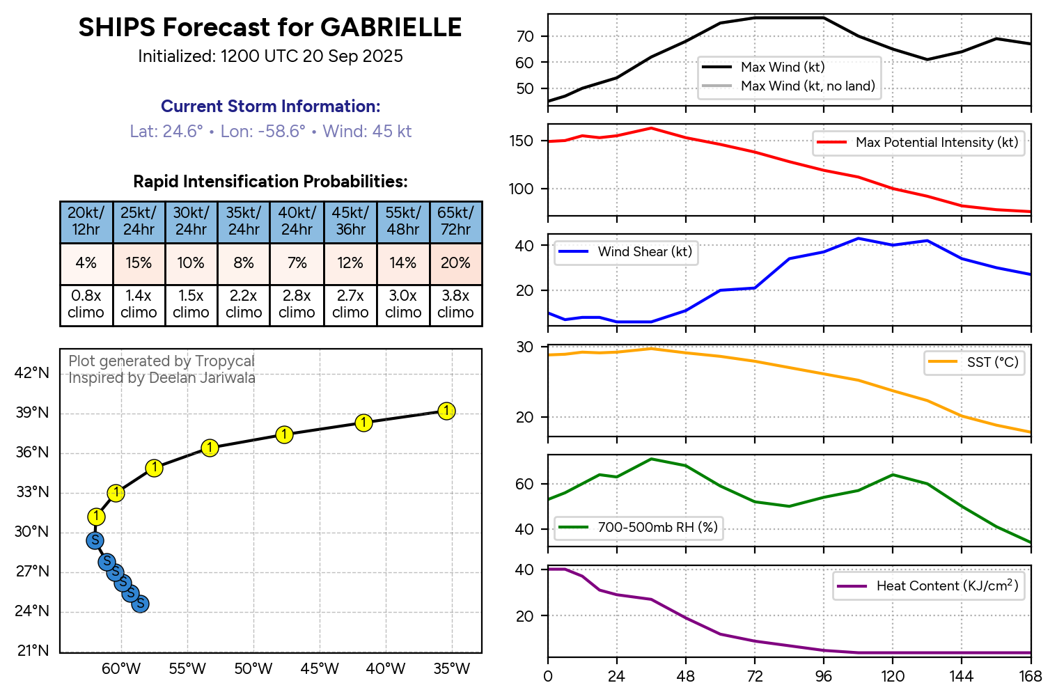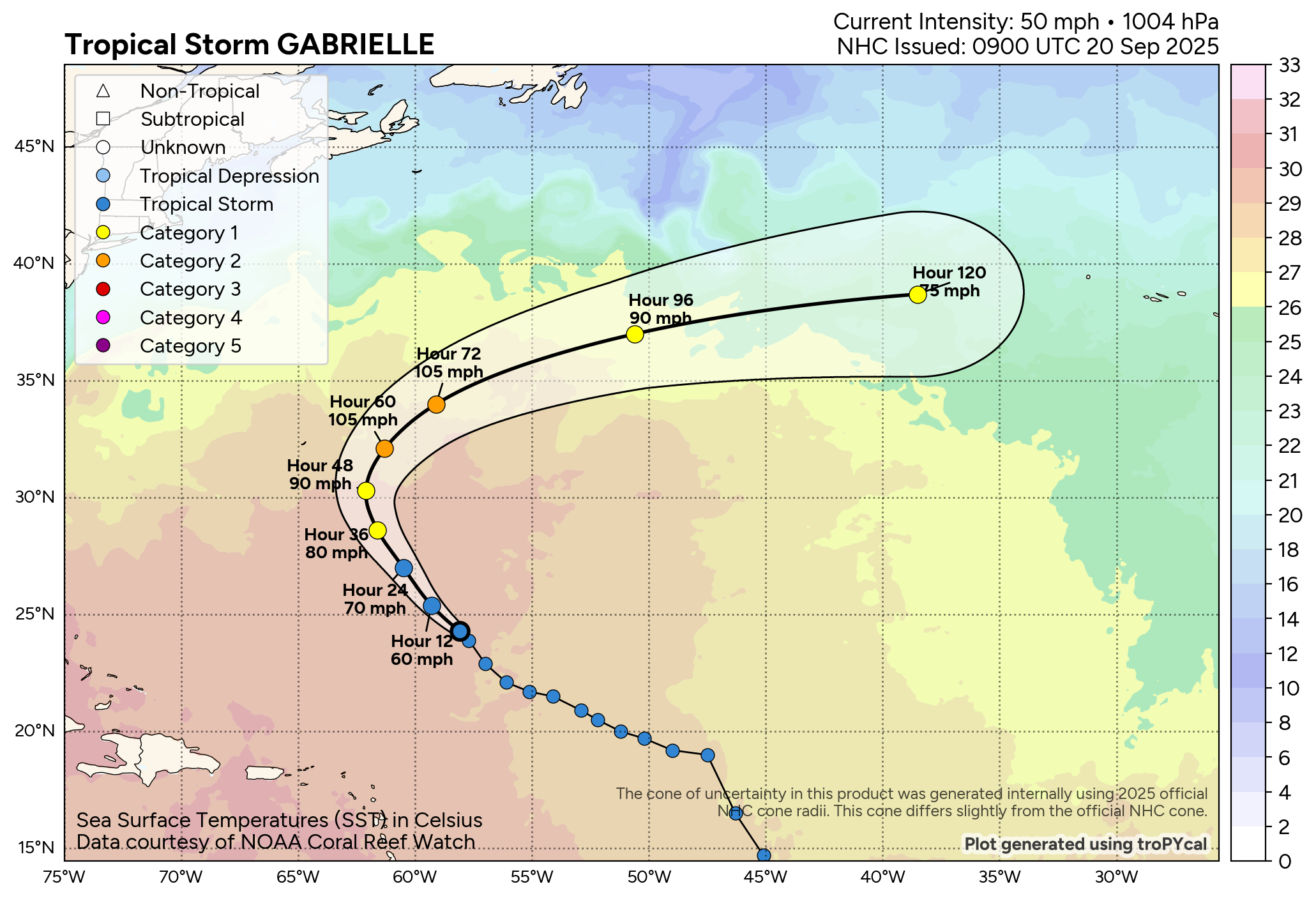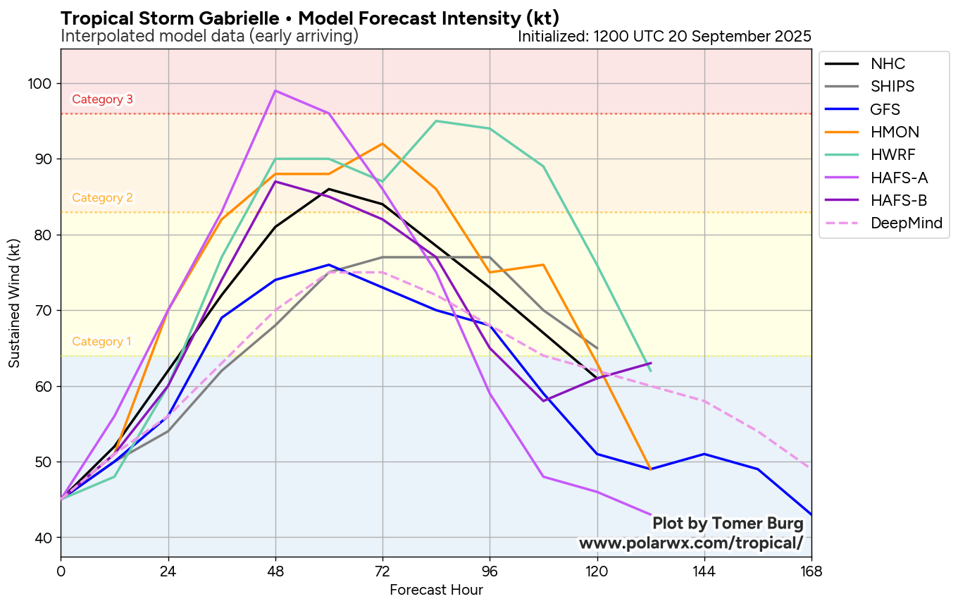 As I already mentioned, the wind shear values over Gabrielle will likely decrease over the next couple of days and this should allow the storm to undergo some quick strengthening as we get into early next week. This means that Gabrielle will likely become a hurricane as soon as late Sunday and may end up peaking at around Category 2 strength during Monday and Tuesday, just as it’s passing to the east of Bermuda.