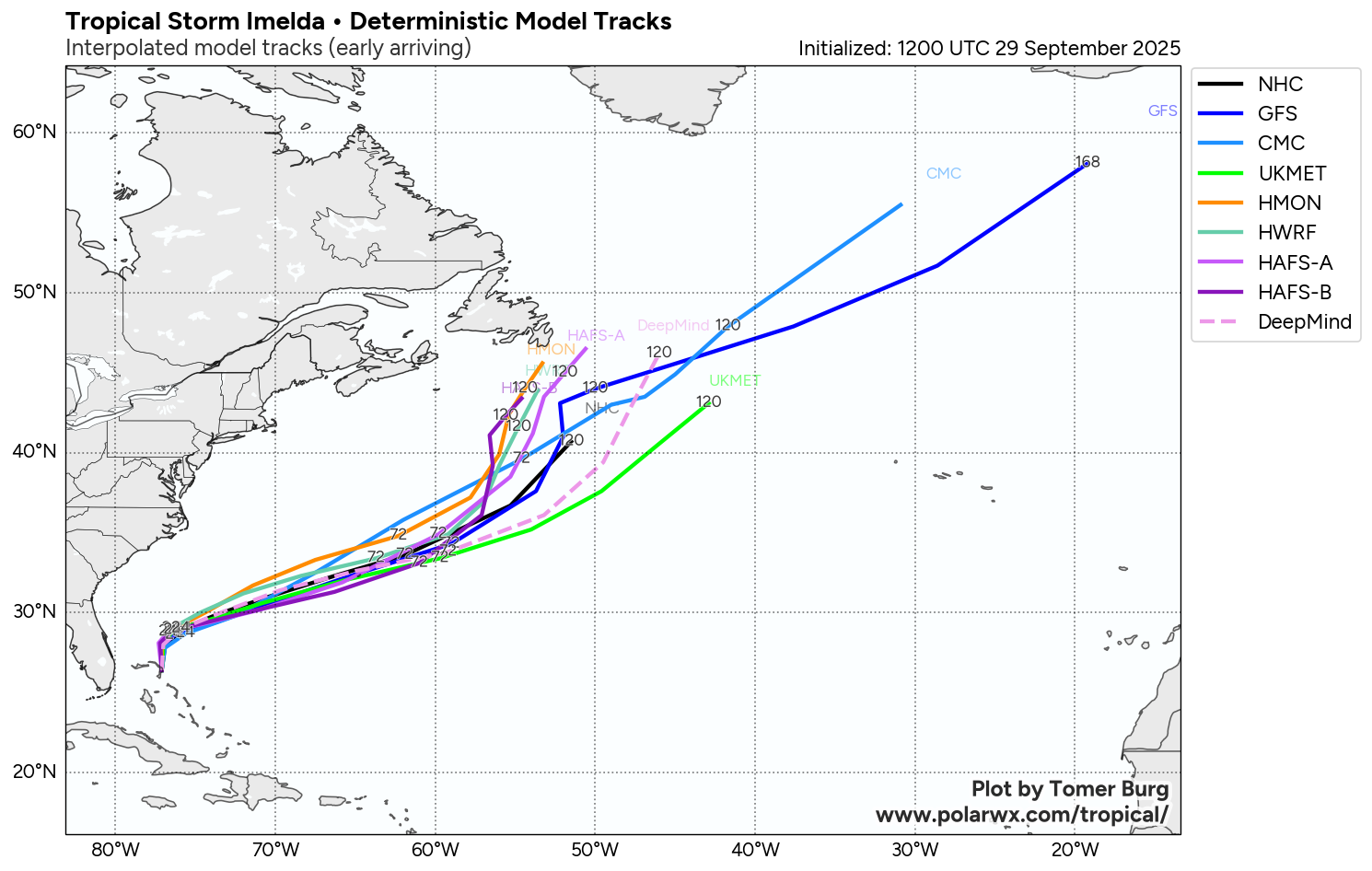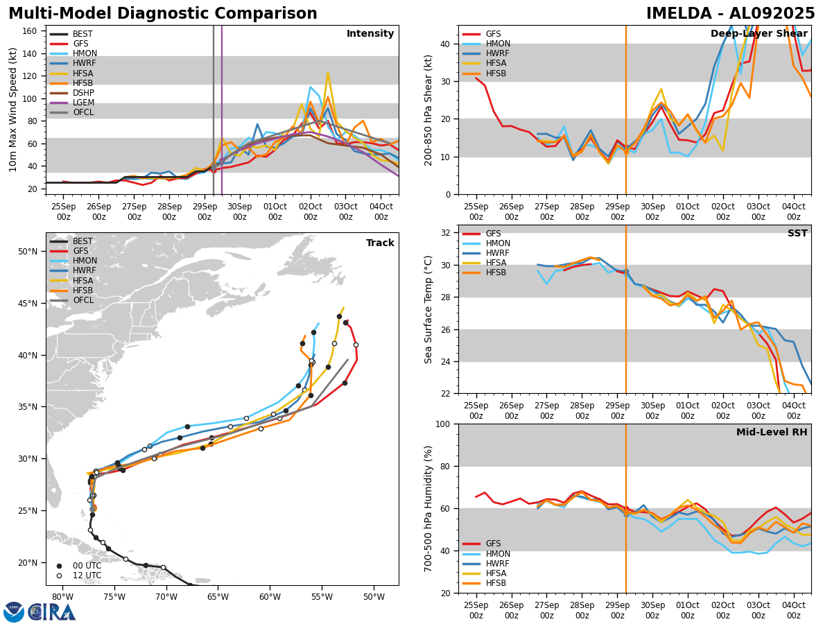 Imelda is moving slowly towards the north & it is expected that this northward track will continue throughout the rest of today and tonight. During Tuesday, Hurricane Humberto, which is located to the east of Imelda, is expected to break down the high pressure ridge causing Imelda to turn abruptly to the east-northeast. This east-northeasterly track is then expected to continue through the middle and later parts of this week.