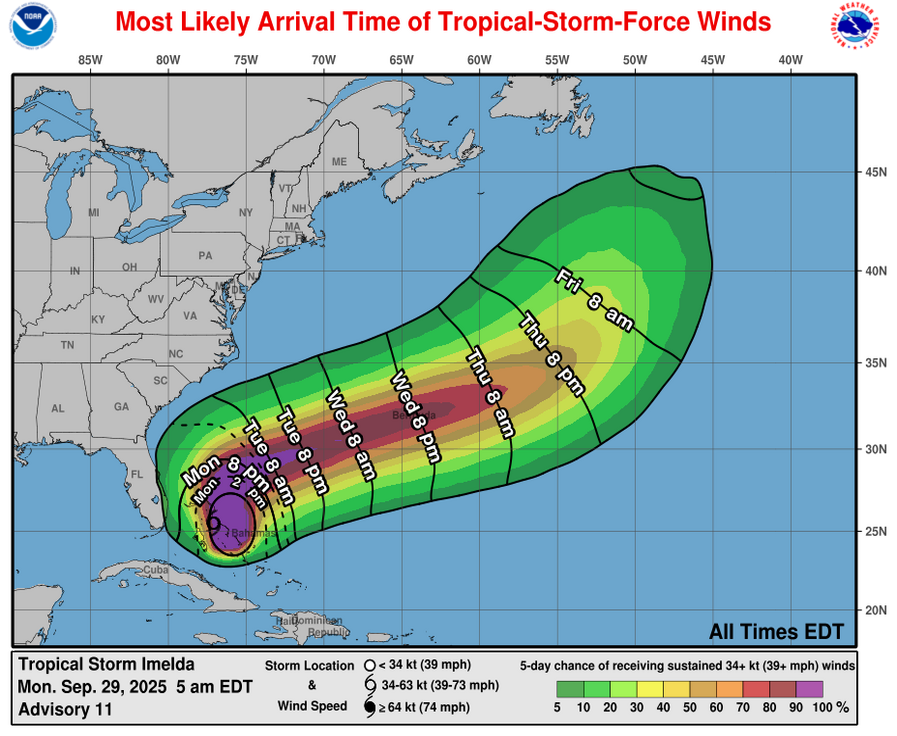 Bermuda: A direct hurricane impact from Imelda is expected on the island of Bermuda on Wednesday night as it appears quite possible that the eye of the hurricane will pass right over the island. This means that tropical storm conditions will develop on Bermuda during Wednesday afternoon. Hurricane conditions with wind gusts of about 100 mph look likely on Wednesday night into Thursday morning. Weather conditions then will rapidly improve by late Thursday and especially Friday.