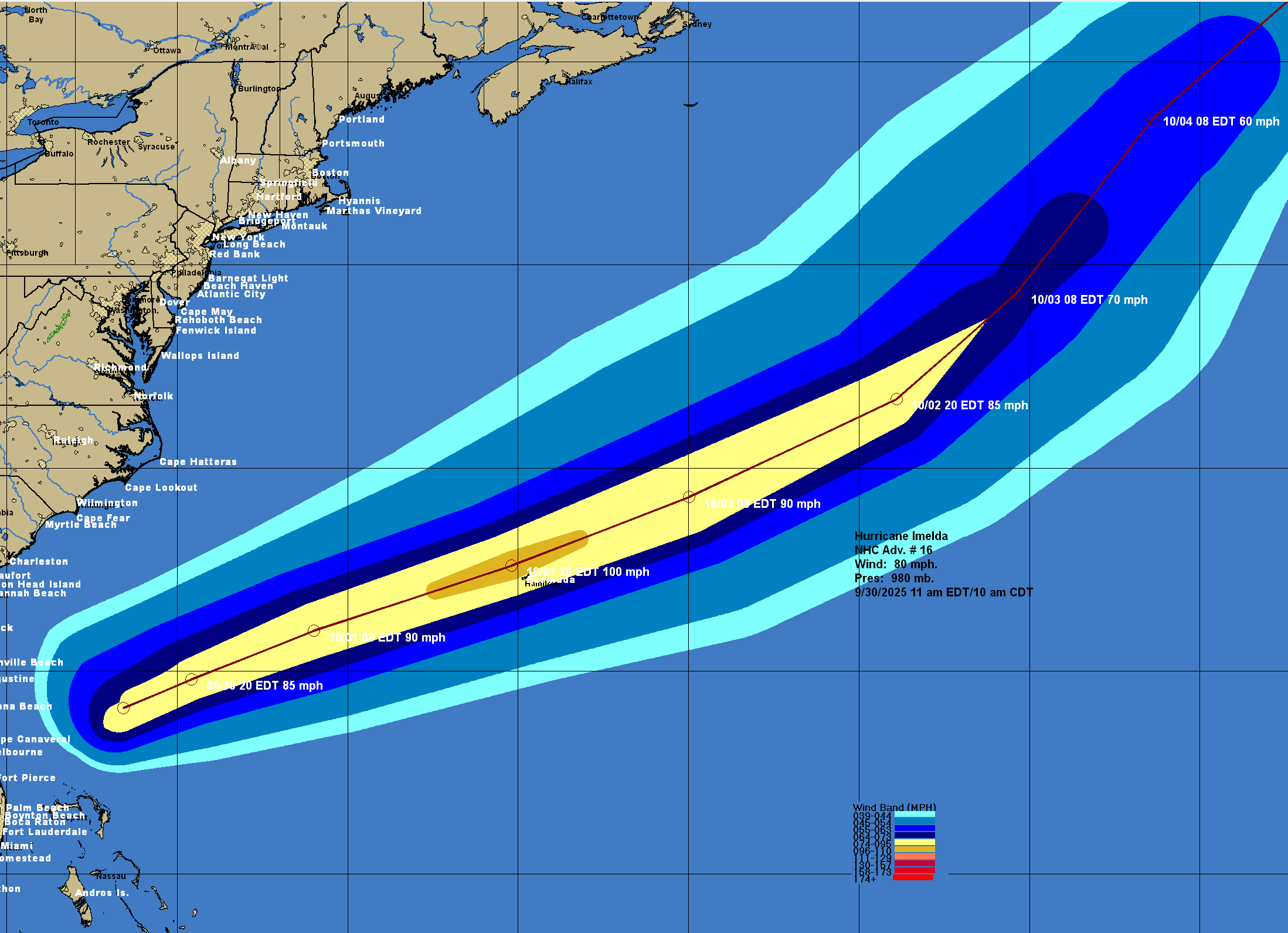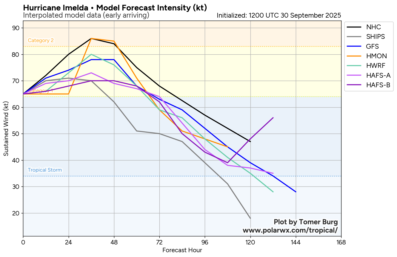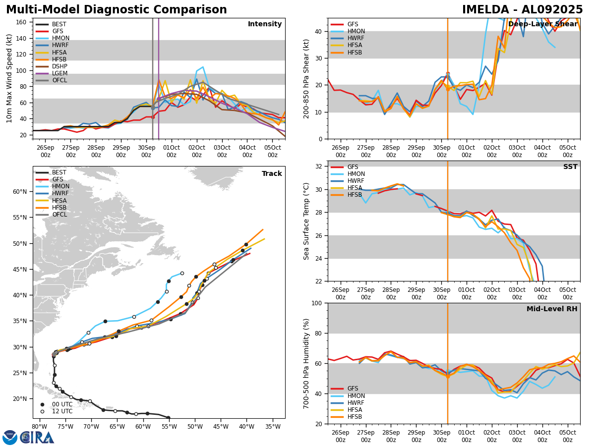 Imelda is now heading towards the northeast and it is expected that this northeast to east-northeast track will continue for the next few days. It is expected that the relative wind shear over Imelda will fall to very low levels by tomorrow as the hurricane will be moving in the same direction as the upper level winds. Because of this, fairly quick strengthening of Imelda is likely & because of this, the hurricane may be about a Category 2 strength when it passes right over Bermuda on Wednesday night.