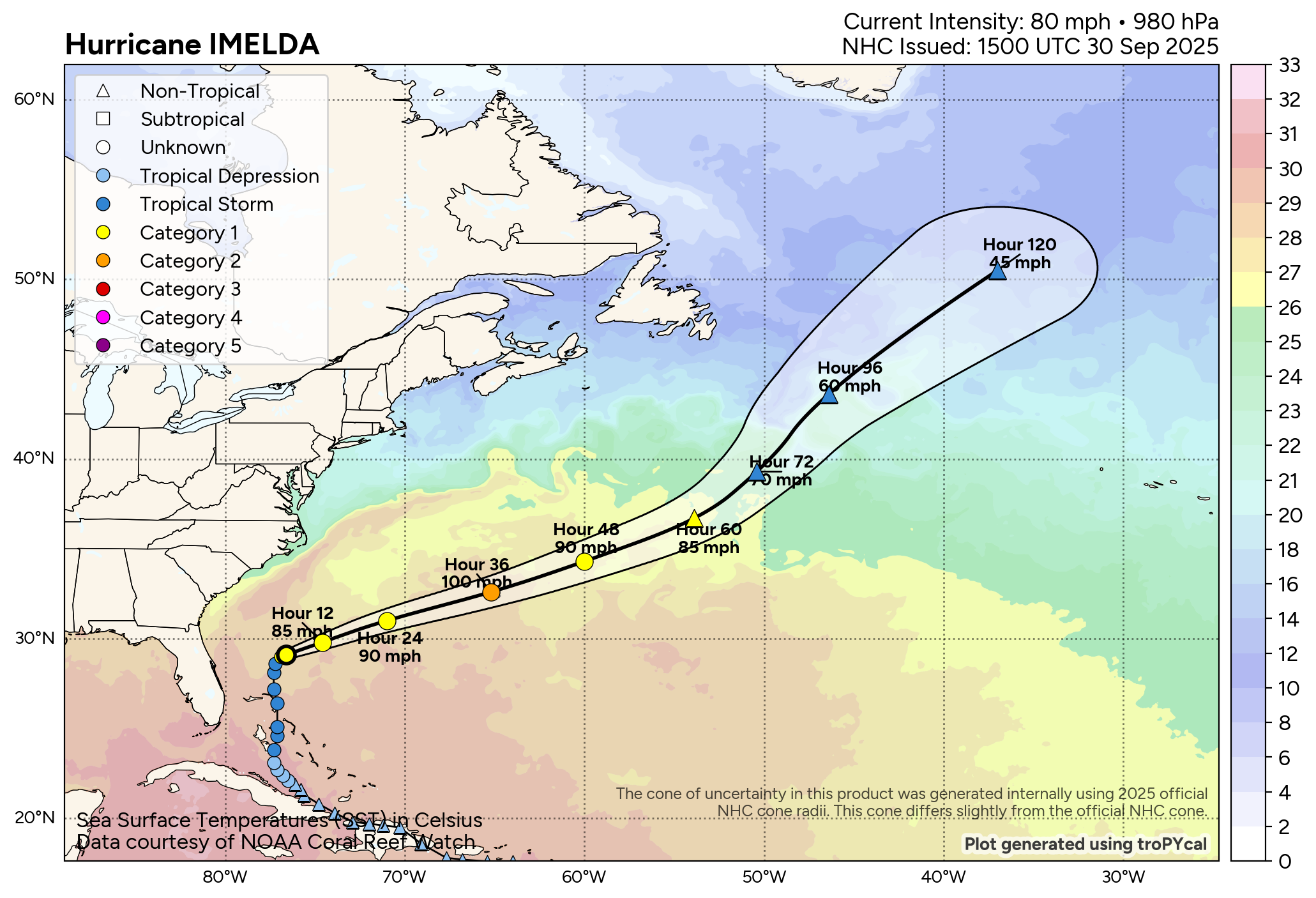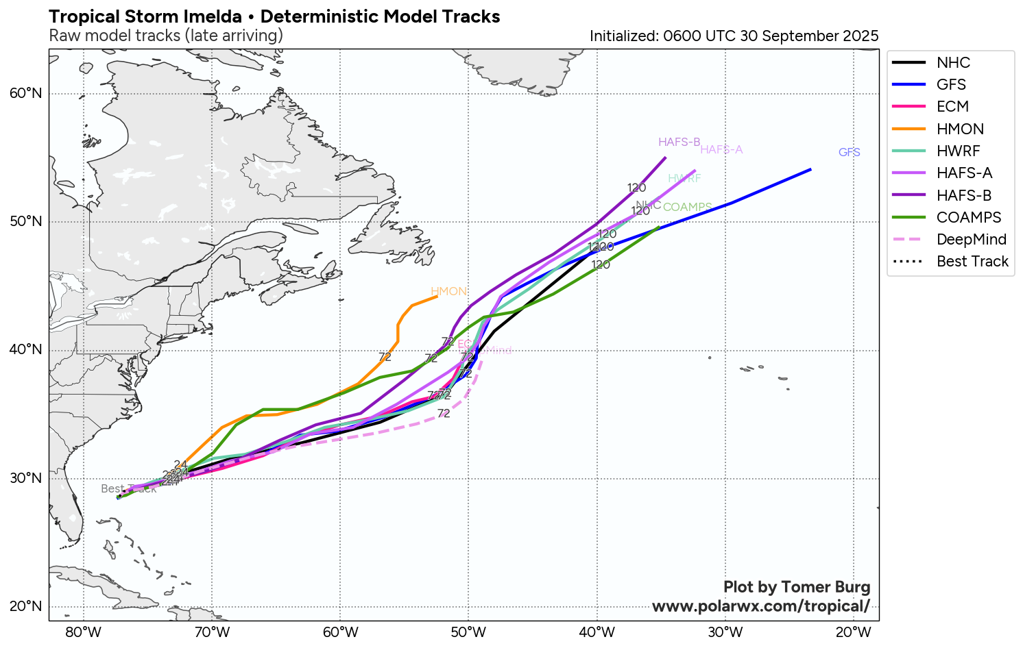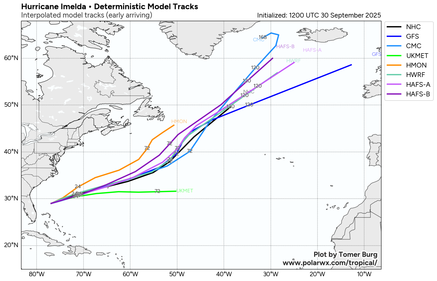 Imelda is now heading towards the northeast and it is expected that this northeast to east-northeast track will continue for the next few days. It is expected that the relative wind shear over Imelda will fall to very low levels by tomorrow as the hurricane will be moving in the same direction as the upper level winds. Because of this, fairly quick strengthening of Imelda is likely & because of this, the hurricane may be about a Category 2 strength when it passes right over Bermuda on Wednesday night.