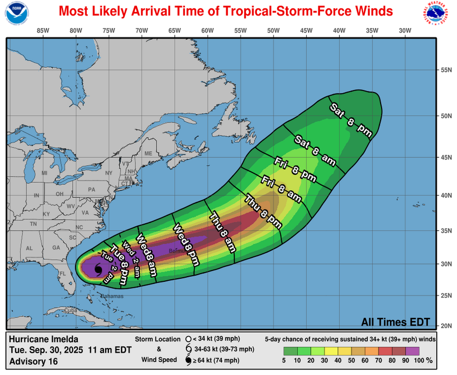 Forecast Impacts For Bermuda: A direct hurricane impact from Imelda is expected on the island of Bermuda on Wednesday night as it appears quite possible that the eye of the hurricane will pass right over the island.