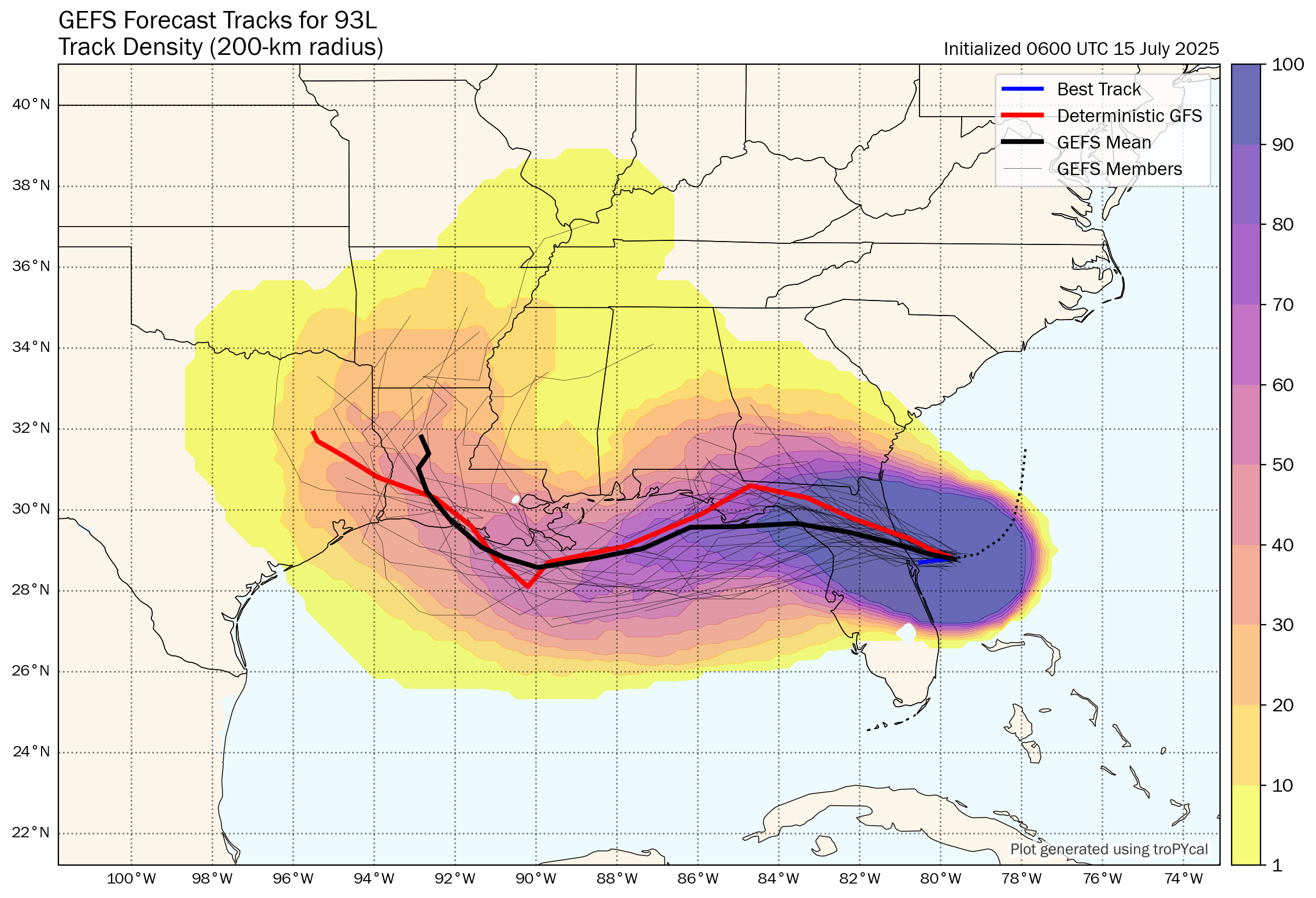 Both the Google Deep Mind AI ensemble guidance and the European ensemble model guidance agree with the track guidance with a majority of members showing Invest 93-L coming ashore on the Louisiana coast between Vermilion Bay and the Mississippi Delta during the day on Thursday.