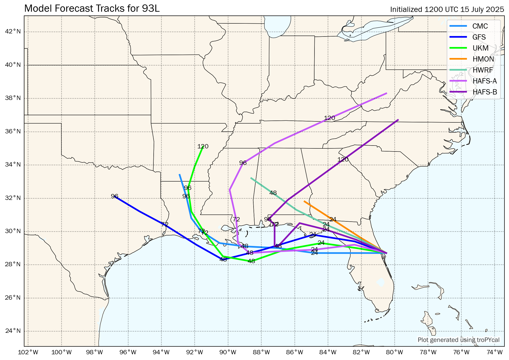 Latest Model Guidance: A majority of track model guidance forecast a westward course across the northeastern and north-central Gulf during Wednesday into Thursday with most models showing Invest 93-L coming ashore in the area of Louisiana between Morgan City and Grand Isle during the day on Thursday.