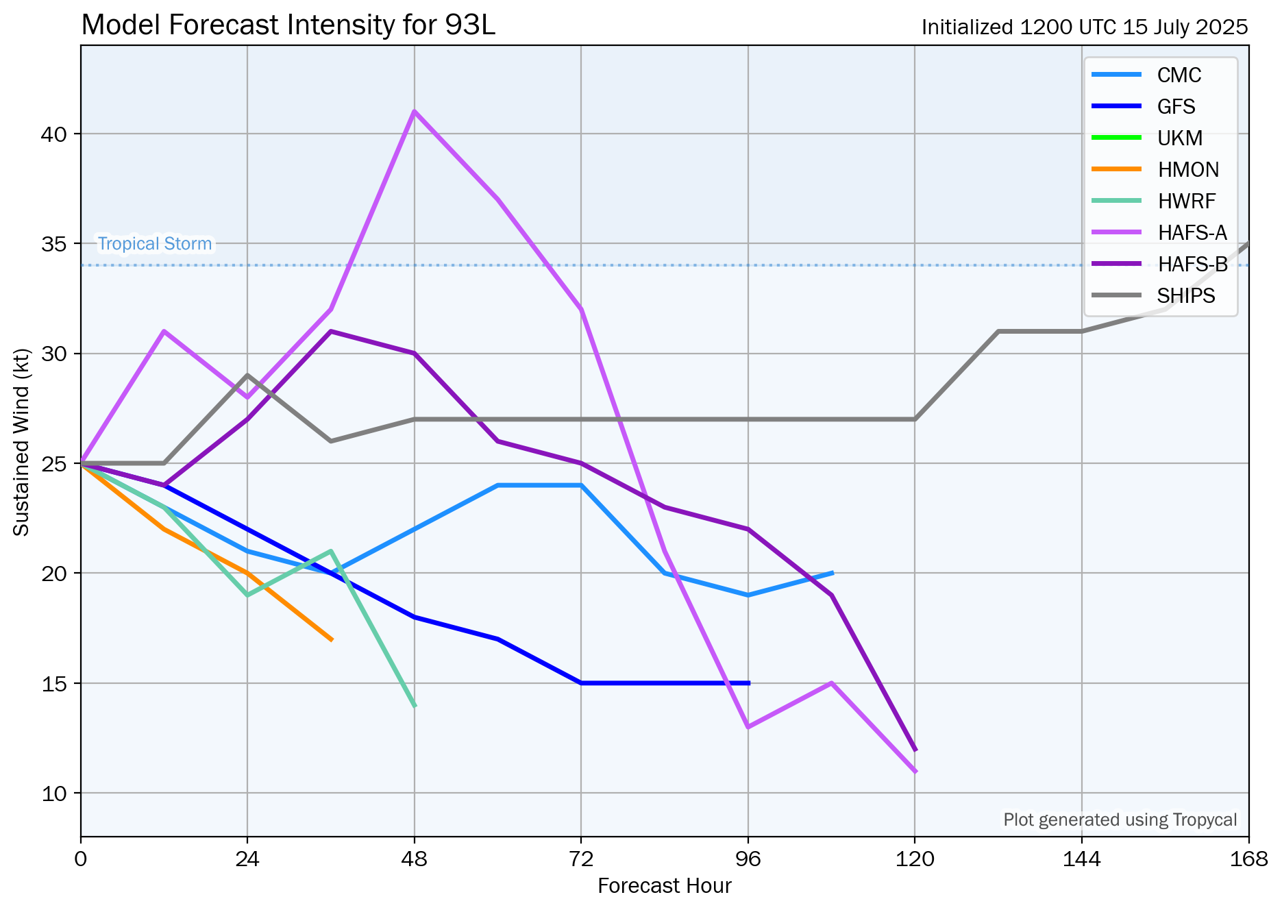 As for the intensity guidance, none of the guidance show Invest 93-L strengthening into a tropical storm and all keep it as a tropical depression, at most.