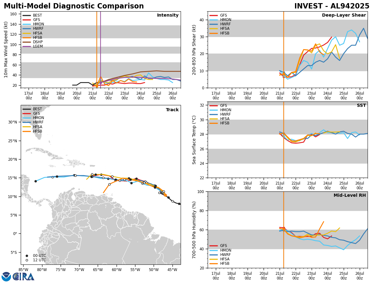 Analysis of environmental conditions reveals that there is strong wind shear occurring on the northern side of the disturbance, although the wind shear values are favorable near the low pressure center. Looking further west, the overall environmental conditions become unfavorable for development once you reach about 60 West Longitude.