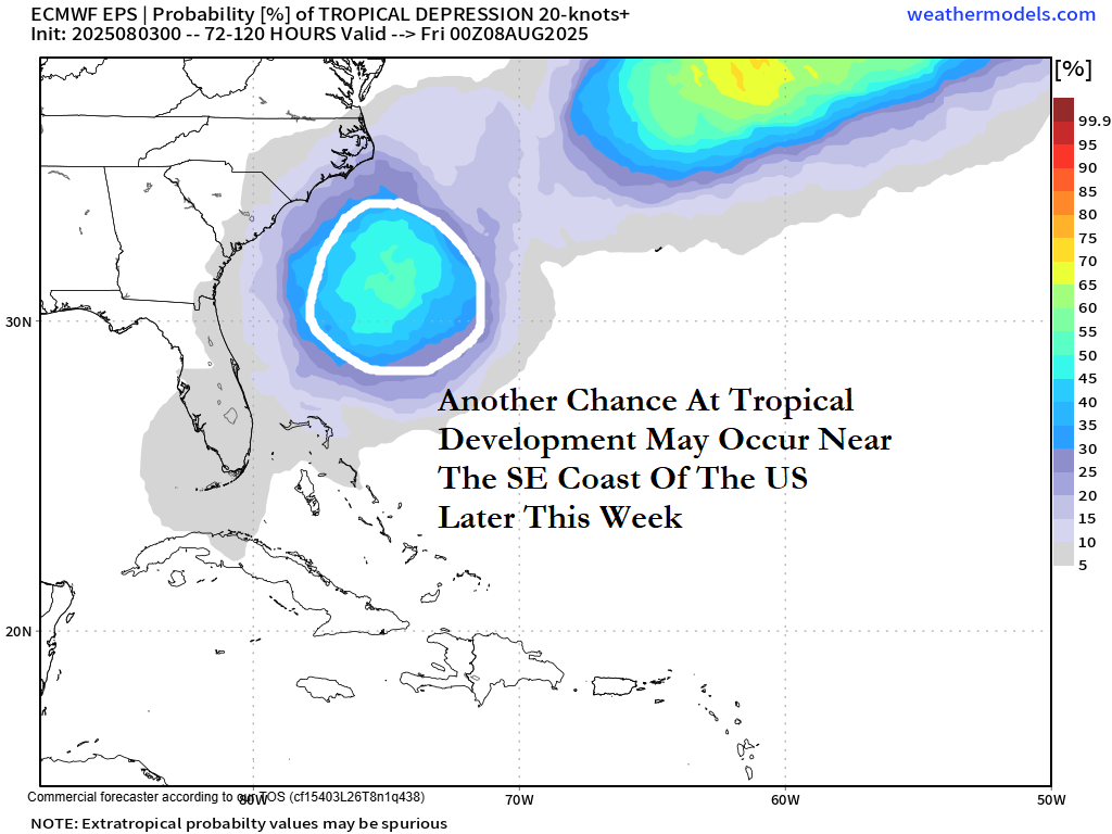 Additional Tropical Development Is Possible Near The Southeast US Coast Later This Week: Following close behind Invest 95-L, it looks quite possible that tropical development could occur near the Southeast coast of the United States by a little later this week. In fact, pretty much all of the model guidance are forecasting this to occur with the differences in the models found where this system might go.