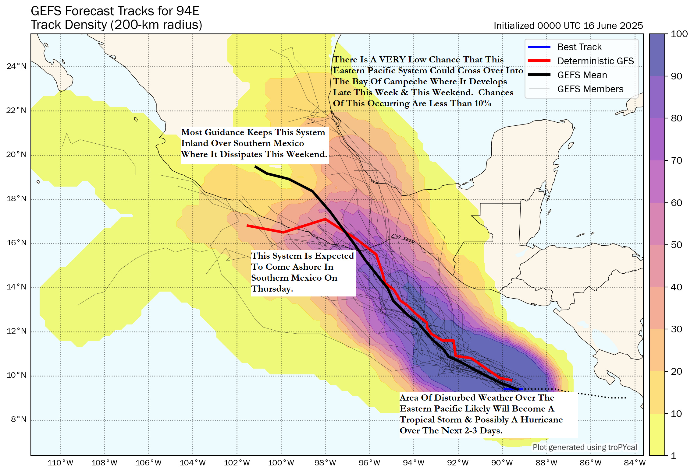 There is uncertainty as to where exactly this disturbance will make landfall later this week and this is important in terms of whether this will be a crossover tropical system or not. Most of the model guidance seems to suggest that there will be no crossover of this system and thus no tropical development will occur in the Bay of Campeche late this week. I suspect that this will actually be the case and because of this, any development in the Bay of Campeche or the southwestern Gulf late this week has a very low chance of occurring (10 percent or less).