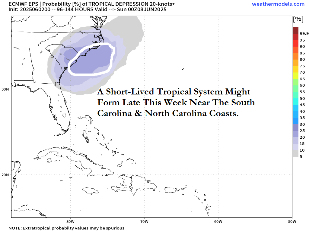 In addition, the European ensemble model guidance is showing upwards of a 20-25 percent chance for tropical development near the North and South Carolina coast late this week into this weekend.