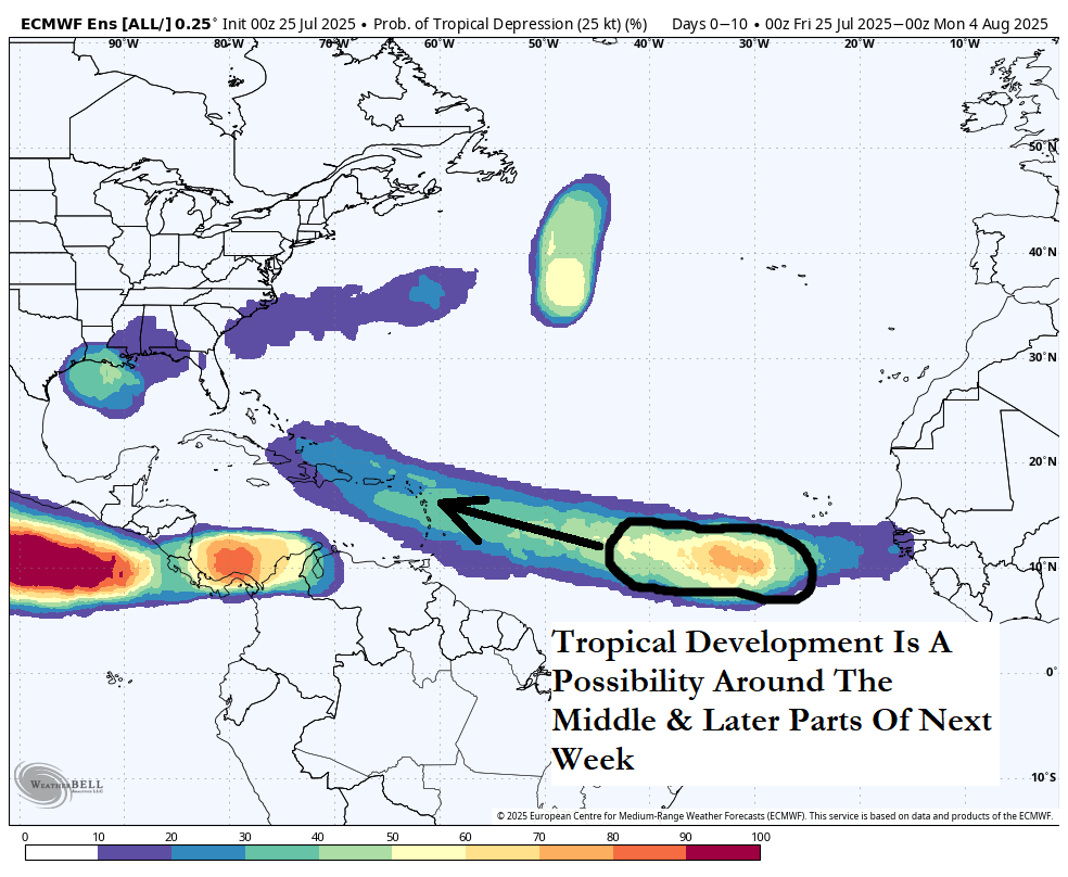 Tropical Development Is A Possibility Over The Central & Eastern Tropical Atlantic Around The Middle & Later Parts Of Next Week: It looks like tropical development could happen during the second half of next week as a tropical wave is expected to push off of the coast of Africa around Monday or Tuesday.