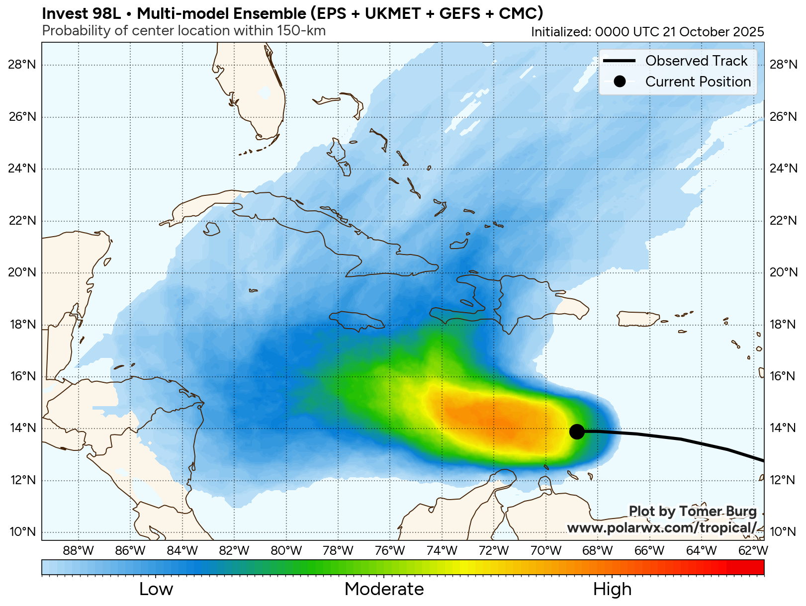 This means that there may be quite a bit in the way of impacts for the islands of the central and northwestern Caribbean from Melissa, both in terms of heavy rainfall & also in the way of winds, depending on the track. This includes Jamaica, Haiti, Cuba and the Cayman Islands. Eventually, the Bahamas may also be significantly impacted by Melissa towards the middle and later parts of next week.