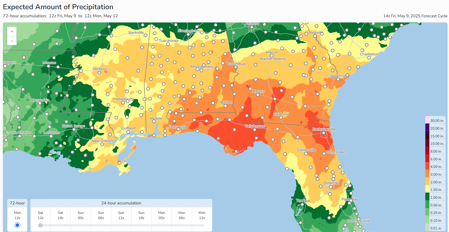 Maximum rainfall totals of 3 to 5 inches are expected from today through this weekend across southern Alabama, central and southern Georgia, all of the Florida Panhandle and north Florida.